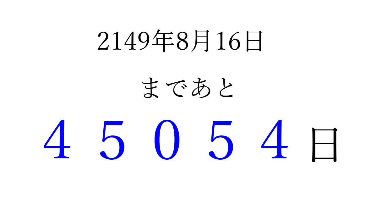 2149年8月16日(土)まで あと 99999 日です 追加すると、トップページからすぐ選べるようになります ※2026/04/09現在の結果です。 最新の状態に更新する ↓シェアして、タイムライン上にカウントダウンを表示しよう!↓ 📤 この結果を共有する Tweet シェア Threads Bluesky 別の日付でカウントダウン 2149年8月のカレンダー このページをブックマークに追加すると、いつでもカウントダウンを確認できます。 (PC: Ctrl+D / Mac: ⌘+D) hitome-notes.comでは以下のページも運営しています。 指定日と期間から日付を計算 | ガチャ確率計算・シミュレーション | プライバシー・ポリシー 運営者:Avocado