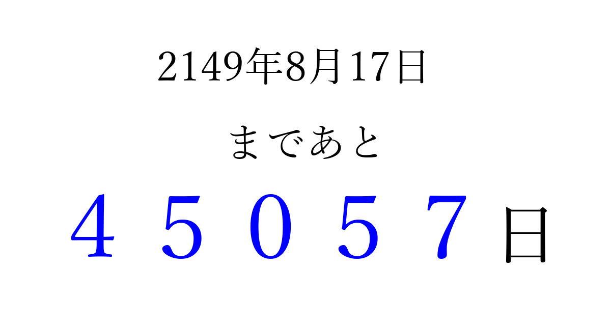 2149年8月17日(日)まで あと 99999 日です 追加すると、トップページからすぐ選べるようになります ※2026/04/07現在の結果です。 最新の状態に更新する ↓シェアして、タイムライン上にカウントダウンを表示しよう!↓ 📤 この結果を共有する Tweet シェア Threads Bluesky 別の日付でカウントダウン 2149年8月のカレンダー このページをブックマークに追加すると、いつでもカウントダウンを確認できます。 (PC: Ctrl+D / Mac: ⌘+D) hitome-notes.comでは以下のページも運営しています。 指定日と期間から日付を計算 | ガチャ確率計算・シミュレーション | プライバシー・ポリシー 運営者:Avocado