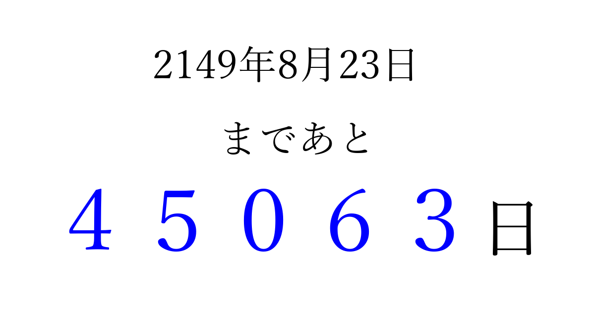 2149年8月23日(土)まで あと 99999 日です 追加すると、トップページからすぐ選べるようになります ※2026/04/07現在の結果です。 最新の状態に更新する ↓シェアして、タイムライン上にカウントダウンを表示しよう!↓ 📤 この結果を共有する Tweet シェア Threads Bluesky 別の日付でカウントダウン 2149年8月のカレンダー このページをブックマークに追加すると、いつでもカウントダウンを確認できます。 (PC: Ctrl+D / Mac: ⌘+D) hitome-notes.comでは以下のページも運営しています。 指定日と期間から日付を計算 | ガチャ確率計算・シミュレーション | プライバシー・ポリシー 運営者:Avocado