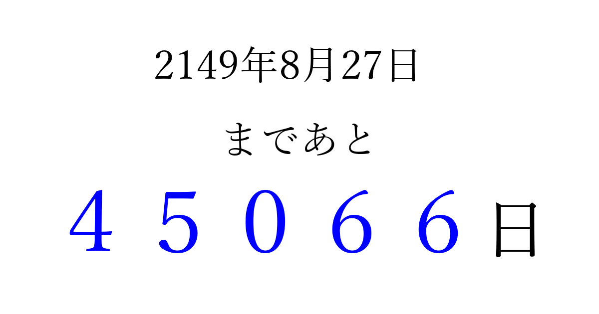 2149年8月27日(水)まで あと 99999 日です 追加すると、トップページからすぐ選べるようになります ※2026/04/08現在の結果です。 最新の状態に更新する ↓シェアして、タイムライン上にカウントダウンを表示しよう!↓ 📤 この結果を共有する Tweet シェア Threads Bluesky 別の日付でカウントダウン 2149年8月のカレンダー このページをブックマークに追加すると、いつでもカウントダウンを確認できます。 (PC: Ctrl+D / Mac: ⌘+D) hitome-notes.comでは以下のページも運営しています。 指定日と期間から日付を計算 | ガチャ確率計算・シミュレーション | プライバシー・ポリシー 運営者:Avocado