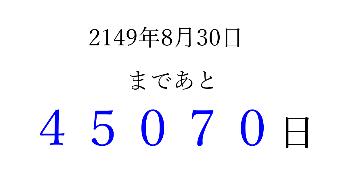 2149年8月30日(土)まで あと 99999 日です 追加すると、トップページからすぐ選べるようになります ※2026/04/07現在の結果です。 最新の状態に更新する ↓シェアして、タイムライン上にカウントダウンを表示しよう!↓ 📤 この結果を共有する Tweet シェア Threads Bluesky 別の日付でカウントダウン 2149年8月のカレンダー このページをブックマークに追加すると、いつでもカウントダウンを確認できます。 (PC: Ctrl+D / Mac: ⌘+D) hitome-notes.comでは以下のページも運営しています。 指定日と期間から日付を計算 | ガチャ確率計算・シミュレーション | プライバシー・ポリシー 運営者:Avocado