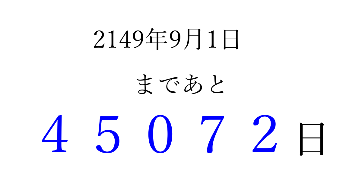 2149年9月1日(月)まで あと 99999 日です 追加すると、トップページからすぐ選べるようになります ※2026/04/07現在の結果です。 最新の状態に更新する ↓シェアして、タイムライン上にカウントダウンを表示しよう!↓ 📤 この結果を共有する Tweet シェア Threads Bluesky 別の日付でカウントダウン 2149年9月のカレンダー このページをブックマークに追加すると、いつでもカウントダウンを確認できます。 (PC: Ctrl+D / Mac: ⌘+D) hitome-notes.comでは以下のページも運営しています。 指定日と期間から日付を計算 | ガチャ確率計算・シミュレーション | プライバシー・ポリシー 運営者:Avocado