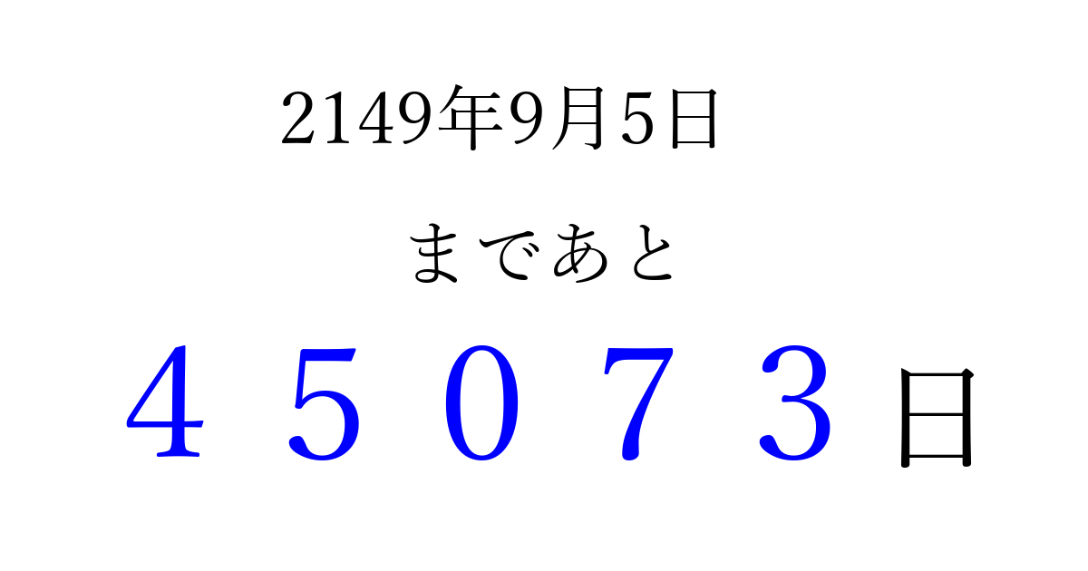 2149年9月5日(金)まで あと 99999 日です 追加すると、トップページからすぐ選べるようになります ※2026/04/10現在の結果です。 最新の状態に更新する ↓シェアして、タイムライン上にカウントダウンを表示しよう!↓ 📤 この結果を共有する Tweet シェア Threads Bluesky 別の日付でカウントダウン 2149年9月のカレンダー このページをブックマークに追加すると、いつでもカウントダウンを確認できます。 (PC: Ctrl+D / Mac: ⌘+D) hitome-notes.comでは以下のページも運営しています。 指定日と期間から日付を計算 | ガチャ確率計算・シミュレーション | プライバシー・ポリシー 運営者:Avocado