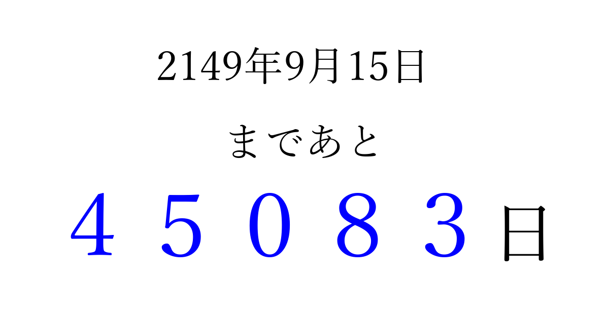 2149年9月15日(月)まで あと 99999 日です 追加すると、トップページからすぐ選べるようになります ※2026/04/10現在の結果です。 最新の状態に更新する ↓シェアして、タイムライン上にカウントダウンを表示しよう!↓ 📤 この結果を共有する Tweet シェア Threads Bluesky 別の日付でカウントダウン 2149年9月のカレンダー このページをブックマークに追加すると、いつでもカウントダウンを確認できます。 (PC: Ctrl+D / Mac: ⌘+D) hitome-notes.comでは以下のページも運営しています。 指定日と期間から日付を計算 | ガチャ確率計算・シミュレーション | プライバシー・ポリシー 運営者:Avocado