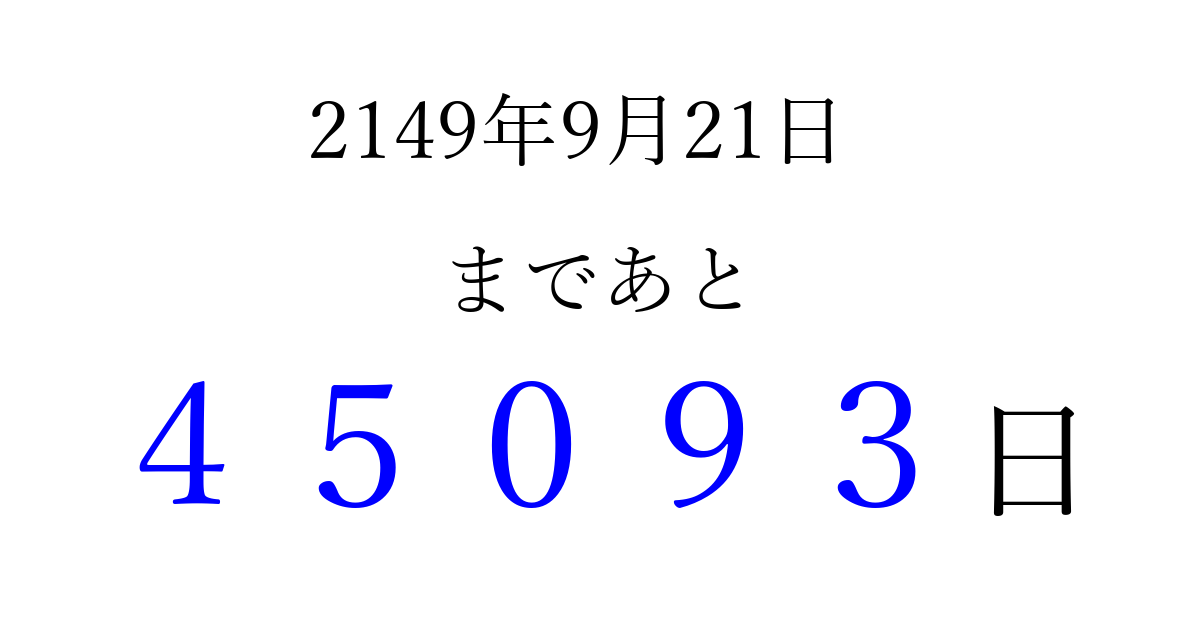 2149年9月21日(日)まで あと 99999 日です 追加すると、トップページからすぐ選べるようになります ※2026/04/06現在の結果です。 最新の状態に更新する ↓シェアして、タイムライン上にカウントダウンを表示しよう!↓ 📤 この結果を共有する Tweet シェア Threads Bluesky 別の日付でカウントダウン 2149年9月のカレンダー このページをブックマークに追加すると、いつでもカウントダウンを確認できます。 (PC: Ctrl+D / Mac: ⌘+D) hitome-notes.comでは以下のページも運営しています。 指定日と期間から日付を計算 | ガチャ確率計算・シミュレーション | プライバシー・ポリシー 運営者:Avocado