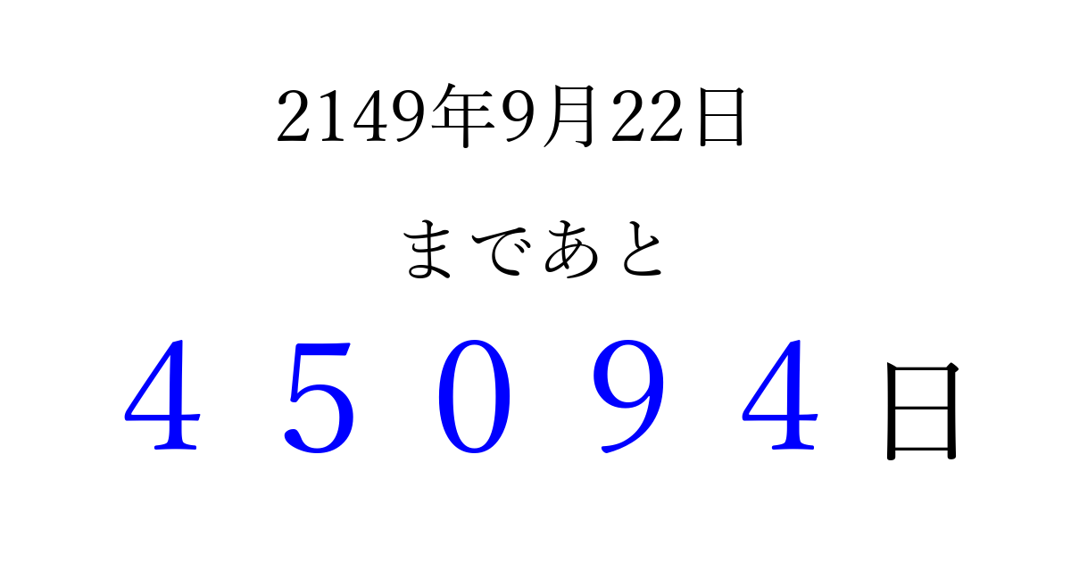 2149年9月22日(月)まで あと 99999 日です 追加すると、トップページからすぐ選べるようになります ※2026/04/06現在の結果です。 最新の状態に更新する ↓シェアして、タイムライン上にカウントダウンを表示しよう!↓ 📤 この結果を共有する Tweet シェア Threads Bluesky 別の日付でカウントダウン 2149年9月のカレンダー このページをブックマークに追加すると、いつでもカウントダウンを確認できます。 (PC: Ctrl+D / Mac: ⌘+D) hitome-notes.comでは以下のページも運営しています。 指定日と期間から日付を計算 | ガチャ確率計算・シミュレーション | プライバシー・ポリシー 運営者:Avocado