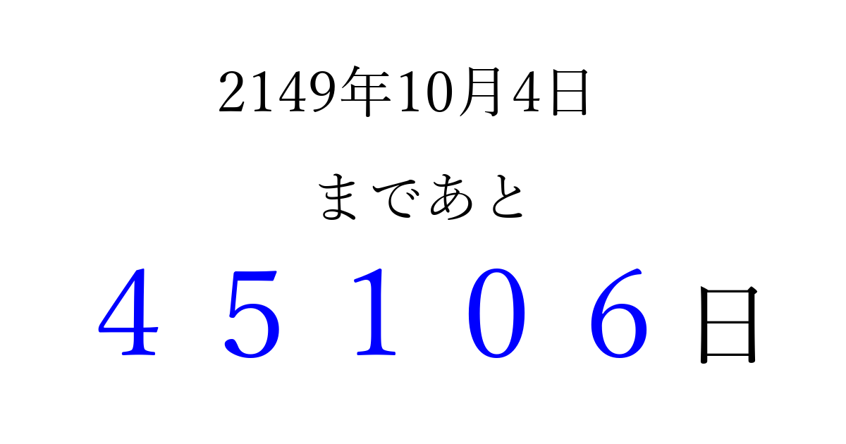 2149年10月4日(土)まで あと 99999 日です 追加すると、トップページからすぐ選べるようになります ※2026/04/06現在の結果です。 最新の状態に更新する ↓シェアして、タイムライン上にカウントダウンを表示しよう!↓ 📤 この結果を共有する Tweet シェア Threads Bluesky 別の日付でカウントダウン 2149年10月のカレンダー このページをブックマークに追加すると、いつでもカウントダウンを確認できます。 (PC: Ctrl+D / Mac: ⌘+D) hitome-notes.comでは以下のページも運営しています。 指定日と期間から日付を計算 | ガチャ確率計算・シミュレーション | プライバシー・ポリシー 運営者:Avocado