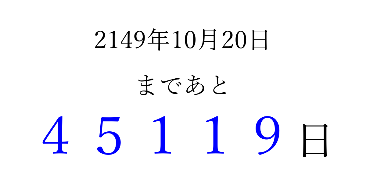 2149年10月20日(月)まで あと 99999 日です 追加すると、トップページからすぐ選べるようになります ※2026/04/09現在の結果です。 最新の状態に更新する ↓シェアして、タイムライン上にカウントダウンを表示しよう!↓ 📤 この結果を共有する Tweet シェア Threads Bluesky 別の日付でカウントダウン 2149年10月のカレンダー このページをブックマークに追加すると、いつでもカウントダウンを確認できます。 (PC: Ctrl+D / Mac: ⌘+D) hitome-notes.comでは以下のページも運営しています。 指定日と期間から日付を計算 | ガチャ確率計算・シミュレーション | プライバシー・ポリシー 運営者:Avocado