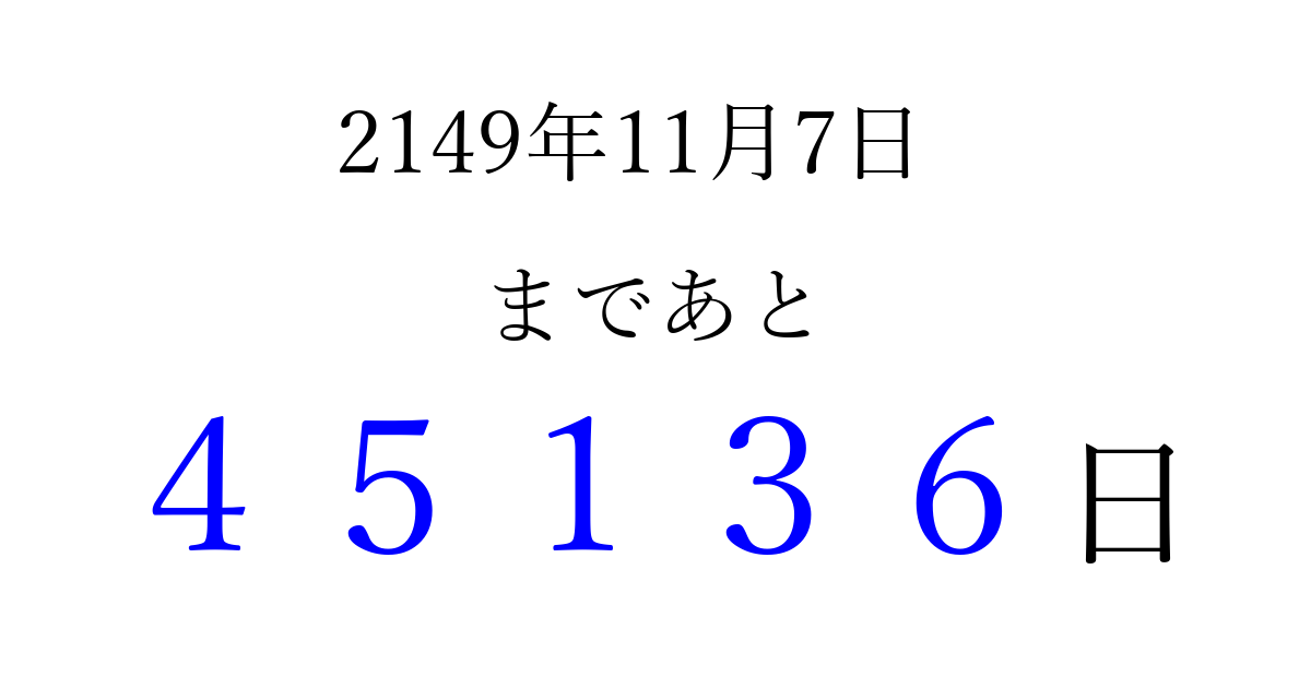 2149年11月7日(金)まで あと 99999 日です 追加すると、トップページからすぐ選べるようになります ※2026/04/10現在の結果です。 最新の状態に更新する ↓シェアして、タイムライン上にカウントダウンを表示しよう!↓ 📤 この結果を共有する Tweet シェア Threads Bluesky 別の日付でカウントダウン 2149年11月のカレンダー このページをブックマークに追加すると、いつでもカウントダウンを確認できます。 (PC: Ctrl+D / Mac: ⌘+D) hitome-notes.comでは以下のページも運営しています。 指定日と期間から日付を計算 | ガチャ確率計算・シミュレーション | プライバシー・ポリシー 運営者:Avocado