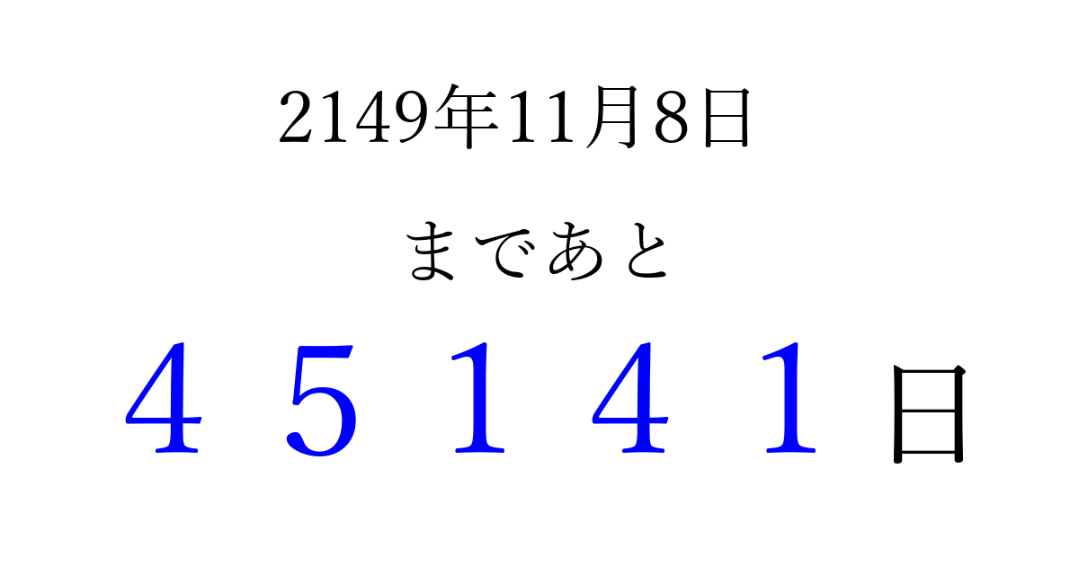 2149年11月8日(土)まで あと 99999 日です 追加すると、トップページからすぐ選べるようになります ※2026/04/06現在の結果です。 最新の状態に更新する ↓シェアして、タイムライン上にカウントダウンを表示しよう!↓ 📤 この結果を共有する Tweet シェア Threads Bluesky 別の日付でカウントダウン 2149年11月のカレンダー このページをブックマークに追加すると、いつでもカウントダウンを確認できます。 (PC: Ctrl+D / Mac: ⌘+D) hitome-notes.comでは以下のページも運営しています。 指定日と期間から日付を計算 | ガチャ確率計算・シミュレーション | プライバシー・ポリシー 運営者:Avocado