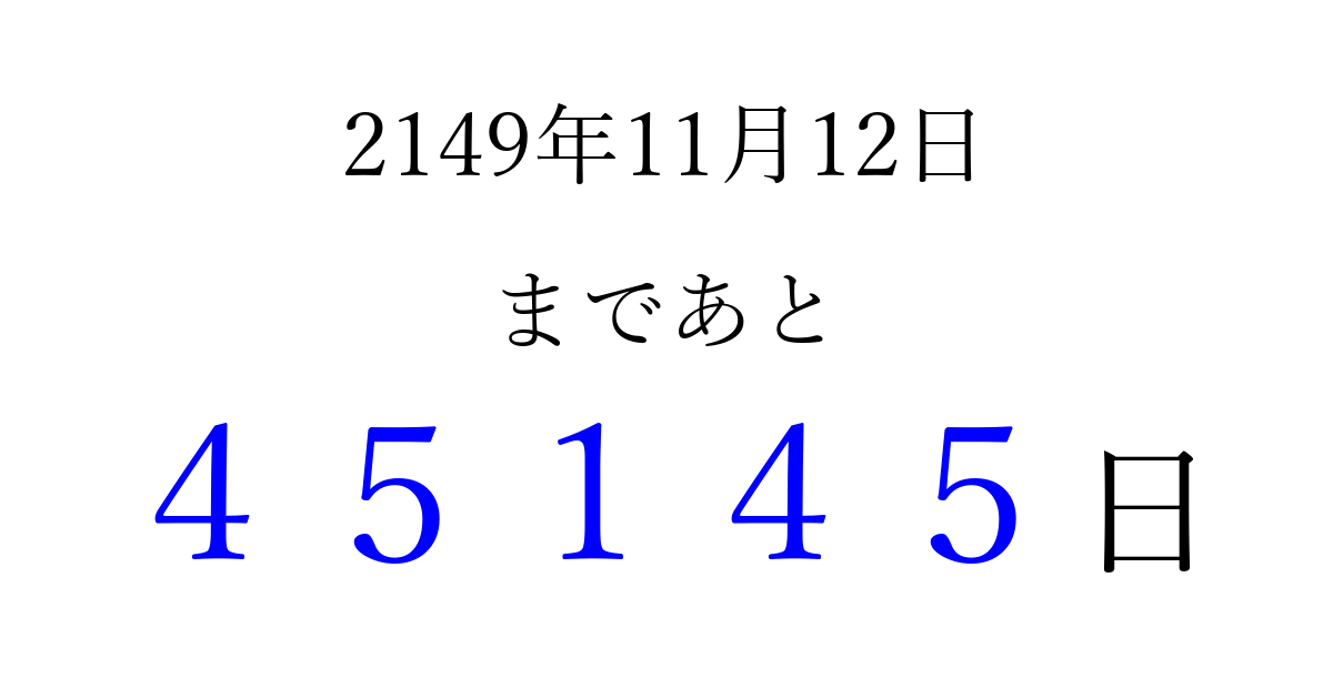 2149年11月12日(水)まで あと 99999 日です 追加すると、トップページからすぐ選べるようになります ※2026/04/06現在の結果です。 最新の状態に更新する ↓シェアして、タイムライン上にカウントダウンを表示しよう!↓ 📤 この結果を共有する Tweet シェア Threads Bluesky 別の日付でカウントダウン 2149年11月のカレンダー このページをブックマークに追加すると、いつでもカウントダウンを確認できます。 (PC: Ctrl+D / Mac: ⌘+D) hitome-notes.comでは以下のページも運営しています。 指定日と期間から日付を計算 | ガチャ確率計算・シミュレーション | プライバシー・ポリシー 運営者:Avocado