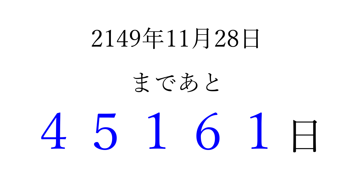 2149年11月28日(金)まで あと 99999 日です 追加すると、トップページからすぐ選べるようになります ※2026/04/06現在の結果です。 最新の状態に更新する ↓シェアして、タイムライン上にカウントダウンを表示しよう!↓ 📤 この結果を共有する Tweet シェア Threads Bluesky 別の日付でカウントダウン 2149年11月のカレンダー このページをブックマークに追加すると、いつでもカウントダウンを確認できます。 (PC: Ctrl+D / Mac: ⌘+D) hitome-notes.comでは以下のページも運営しています。 指定日と期間から日付を計算 | ガチャ確率計算・シミュレーション | プライバシー・ポリシー 運営者:Avocado