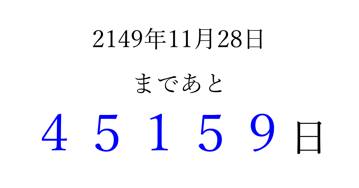 2149年11月28日(金)まで あと 99999 日です 追加すると、トップページからすぐ選べるようになります ※2026/04/08現在の結果です。 最新の状態に更新する ↓シェアして、タイムライン上にカウントダウンを表示しよう!↓ 📤 この結果を共有する Tweet シェア Threads Bluesky 別の日付でカウントダウン 2149年11月のカレンダー このページをブックマークに追加すると、いつでもカウントダウンを確認できます。 (PC: Ctrl+D / Mac: ⌘+D) hitome-notes.comでは以下のページも運営しています。 指定日と期間から日付を計算 | ガチャ確率計算・シミュレーション | プライバシー・ポリシー 運営者:Avocado