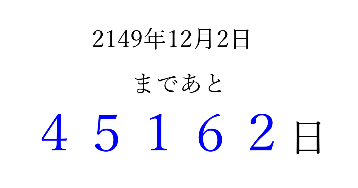 2149年12月2日(火)まで あと 99999 日です 追加すると、トップページからすぐ選べるようになります ※2026/04/09現在の結果です。 最新の状態に更新する ↓シェアして、タイムライン上にカウントダウンを表示しよう!↓ 📤 この結果を共有する Tweet シェア Threads Bluesky 別の日付でカウントダウン 2149年12月のカレンダー このページをブックマークに追加すると、いつでもカウントダウンを確認できます。 (PC: Ctrl+D / Mac: ⌘+D) hitome-notes.comでは以下のページも運営しています。 指定日と期間から日付を計算 | ガチャ確率計算・シミュレーション | プライバシー・ポリシー 運営者:Avocado