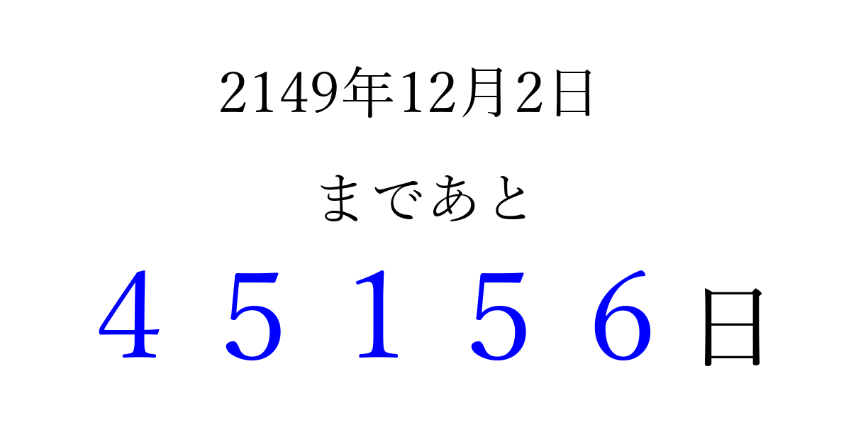 2149年12月2日(火)まで あと 99999 日です 追加すると、トップページからすぐ選べるようになります ※2026/04/15現在の結果です。 最新の状態に更新する ↓シェアして、タイムライン上にカウントダウンを表示しよう!↓ 📤 この結果を共有する Tweet シェア Threads Bluesky 別の日付でカウントダウン 2149年12月のカレンダー このページをブックマークに追加すると、いつでもカウントダウンを確認できます。 (PC: Ctrl+D / Mac: ⌘+D) hitome-notes.comでは以下のページも運営しています。 指定日と期間から日付を計算 | ガチャ確率計算・シミュレーション | プライバシー・ポリシー 運営者:Avocado