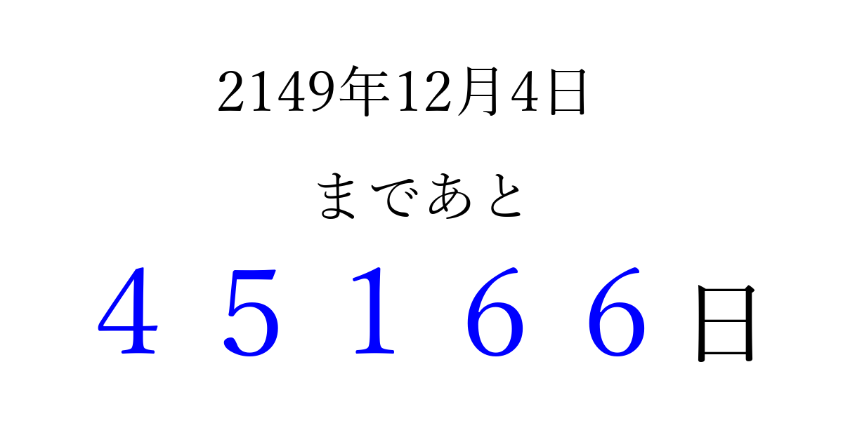 2149年12月4日(木)まで あと 99999 日です 追加すると、トップページからすぐ選べるようになります ※2026/04/07現在の結果です。 最新の状態に更新する ↓シェアして、タイムライン上にカウントダウンを表示しよう!↓ 📤 この結果を共有する Tweet シェア Threads Bluesky 別の日付でカウントダウン 2149年12月のカレンダー このページをブックマークに追加すると、いつでもカウントダウンを確認できます。 (PC: Ctrl+D / Mac: ⌘+D) hitome-notes.comでは以下のページも運営しています。 指定日と期間から日付を計算 | ガチャ確率計算・シミュレーション | プライバシー・ポリシー 運営者:Avocado