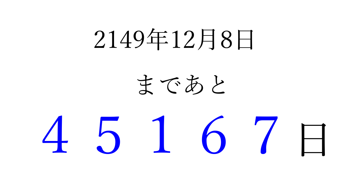 2149年12月8日(月)まで あと 99999 日です 追加すると、トップページからすぐ選べるようになります ※2026/04/10現在の結果です。 最新の状態に更新する ↓シェアして、タイムライン上にカウントダウンを表示しよう!↓ 📤 この結果を共有する Tweet シェア Threads Bluesky 別の日付でカウントダウン 2149年12月のカレンダー このページをブックマークに追加すると、いつでもカウントダウンを確認できます。 (PC: Ctrl+D / Mac: ⌘+D) hitome-notes.comでは以下のページも運営しています。 指定日と期間から日付を計算 | ガチャ確率計算・シミュレーション | プライバシー・ポリシー 運営者:Avocado