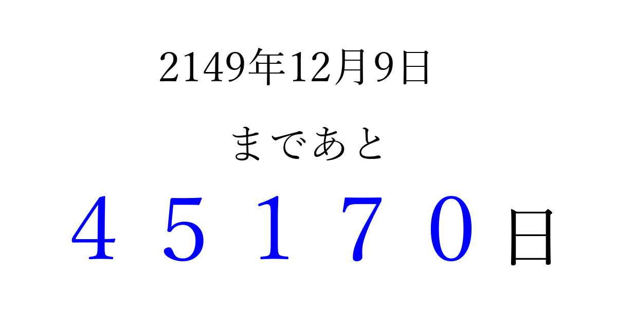 2149年12月9日(火)まで あと 99999 日です 追加すると、トップページからすぐ選べるようになります ※2026/04/08現在の結果です。 最新の状態に更新する ↓シェアして、タイムライン上にカウントダウンを表示しよう!↓ 📤 この結果を共有する Tweet シェア Threads Bluesky 別の日付でカウントダウン 2149年12月のカレンダー このページをブックマークに追加すると、いつでもカウントダウンを確認できます。 (PC: Ctrl+D / Mac: ⌘+D) hitome-notes.comでは以下のページも運営しています。 指定日と期間から日付を計算 | ガチャ確率計算・シミュレーション | プライバシー・ポリシー 運営者:Avocado