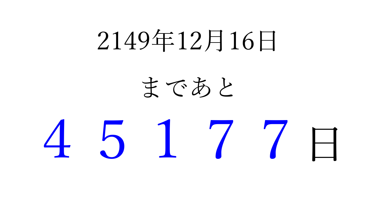 2149年12月16日(火)まで あと 99999 日です 追加すると、トップページからすぐ選べるようになります ※2026/04/08現在の結果です。 最新の状態に更新する ↓シェアして、タイムライン上にカウントダウンを表示しよう!↓ 📤 この結果を共有する Tweet シェア Threads Bluesky 別の日付でカウントダウン 2149年12月のカレンダー このページをブックマークに追加すると、いつでもカウントダウンを確認できます。 (PC: Ctrl+D / Mac: ⌘+D) hitome-notes.comでは以下のページも運営しています。 指定日と期間から日付を計算 | ガチャ確率計算・シミュレーション | プライバシー・ポリシー 運営者:Avocado