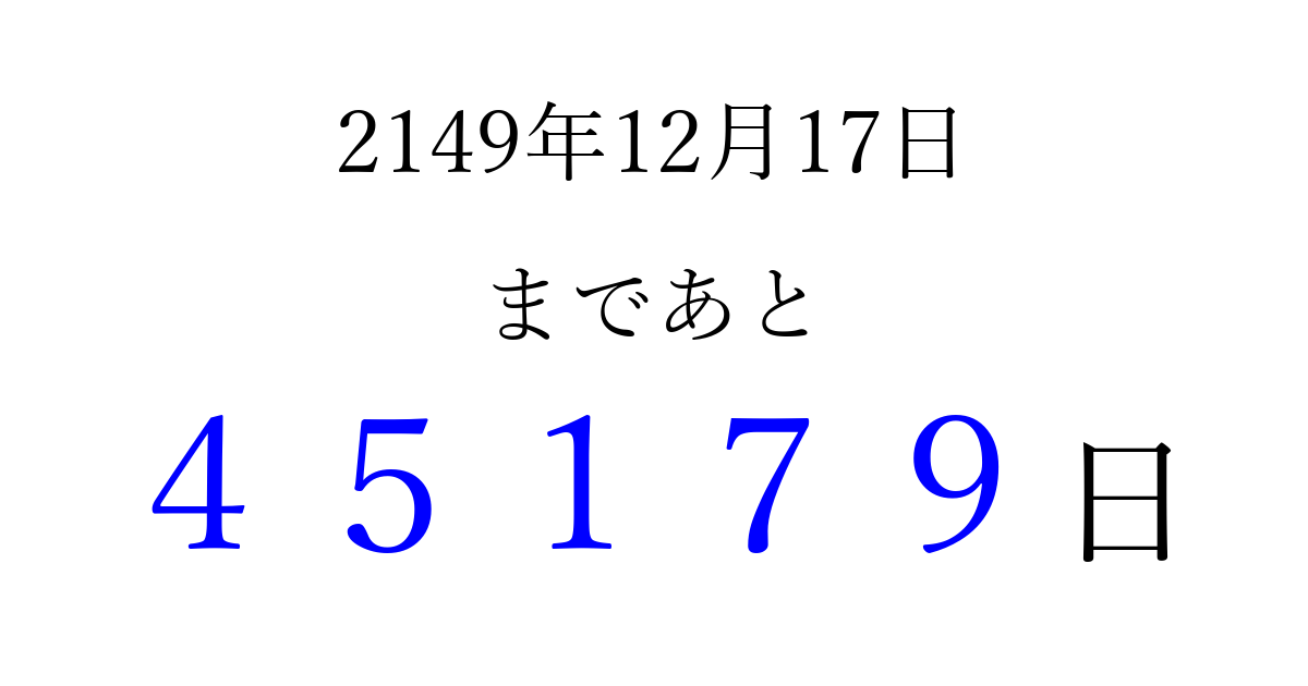 2149年12月17日(水)まで あと 99999 日です 追加すると、トップページからすぐ選べるようになります ※2026/04/07現在の結果です。 最新の状態に更新する ↓シェアして、タイムライン上にカウントダウンを表示しよう!↓ 📤 この結果を共有する Tweet シェア Threads Bluesky 別の日付でカウントダウン 2149年12月のカレンダー このページをブックマークに追加すると、いつでもカウントダウンを確認できます。 (PC: Ctrl+D / Mac: ⌘+D) hitome-notes.comでは以下のページも運営しています。 指定日と期間から日付を計算 | ガチャ確率計算・シミュレーション | プライバシー・ポリシー 運営者:Avocado