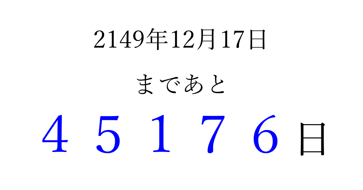 2149年12月17日(水)まで あと 99999 日です 追加すると、トップページからすぐ選べるようになります ※2026/04/10現在の結果です。 最新の状態に更新する ↓シェアして、タイムライン上にカウントダウンを表示しよう!↓ 📤 この結果を共有する Tweet シェア Threads Bluesky 別の日付でカウントダウン 2149年12月のカレンダー このページをブックマークに追加すると、いつでもカウントダウンを確認できます。 (PC: Ctrl+D / Mac: ⌘+D) hitome-notes.comでは以下のページも運営しています。 指定日と期間から日付を計算 | ガチャ確率計算・シミュレーション | プライバシー・ポリシー 運営者:Avocado