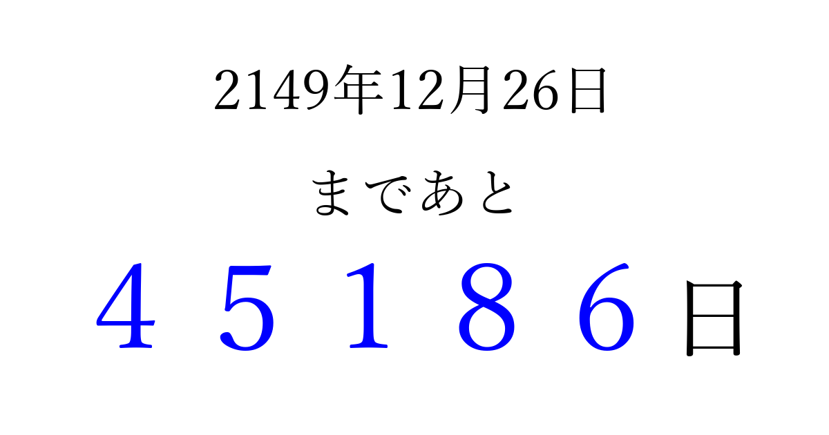2149年12月26日(金)まで あと 99999 日です 追加すると、トップページからすぐ選べるようになります ※2026/04/09現在の結果です。 最新の状態に更新する ↓シェアして、タイムライン上にカウントダウンを表示しよう!↓ 📤 この結果を共有する Tweet シェア Threads Bluesky 別の日付でカウントダウン 2149年12月のカレンダー このページをブックマークに追加すると、いつでもカウントダウンを確認できます。 (PC: Ctrl+D / Mac: ⌘+D) hitome-notes.comでは以下のページも運営しています。 指定日と期間から日付を計算 | ガチャ確率計算・シミュレーション | プライバシー・ポリシー 運営者:Avocado