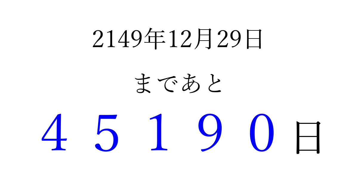 2149年12月29日(月)まで あと 99999 日です 追加すると、トップページからすぐ選べるようになります ※2026/04/08現在の結果です。 最新の状態に更新する ↓シェアして、タイムライン上にカウントダウンを表示しよう!↓ 📤 この結果を共有する Tweet シェア Threads Bluesky 別の日付でカウントダウン 2149年12月のカレンダー このページをブックマークに追加すると、いつでもカウントダウンを確認できます。 (PC: Ctrl+D / Mac: ⌘+D) hitome-notes.comでは以下のページも運営しています。 指定日と期間から日付を計算 | ガチャ確率計算・シミュレーション | プライバシー・ポリシー 運営者:Avocado