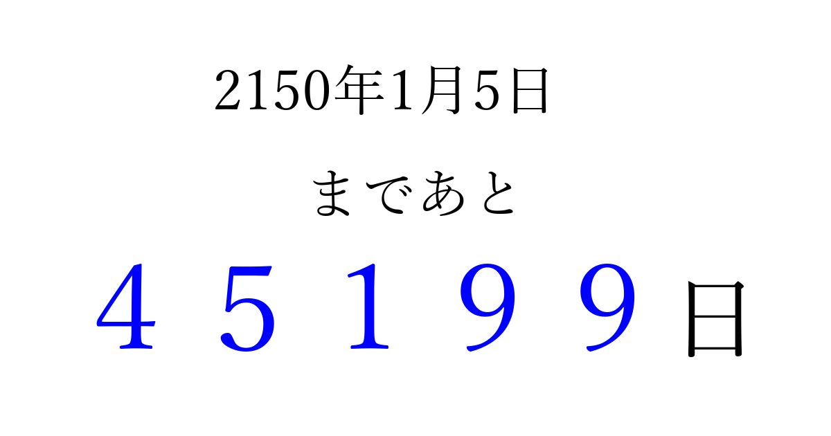2150年1月5日(月)まで あと 99999 日です 追加すると、トップページからすぐ選べるようになります ※2026/04/06現在の結果です。 最新の状態に更新する ↓シェアして、タイムライン上にカウントダウンを表示しよう!↓ 📤 この結果を共有する Tweet シェア Threads Bluesky 別の日付でカウントダウン 2150年1月のカレンダー このページをブックマークに追加すると、いつでもカウントダウンを確認できます。 (PC: Ctrl+D / Mac: ⌘+D) hitome-notes.comでは以下のページも運営しています。 指定日と期間から日付を計算 | ガチャ確率計算・シミュレーション | プライバシー・ポリシー 運営者:Avocado