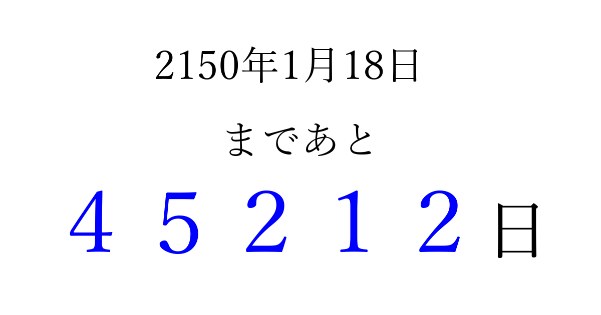 2150年1月18日(日)まで あと 99999 日です 追加すると、トップページからすぐ選べるようになります ※2026/04/06現在の結果です。 最新の状態に更新する ↓シェアして、タイムライン上にカウントダウンを表示しよう!↓ 📤 この結果を共有する Tweet シェア Threads Bluesky 別の日付でカウントダウン 2150年1月のカレンダー このページをブックマークに追加すると、いつでもカウントダウンを確認できます。 (PC: Ctrl+D / Mac: ⌘+D) hitome-notes.comでは以下のページも運営しています。 指定日と期間から日付を計算 | ガチャ確率計算・シミュレーション | プライバシー・ポリシー 運営者:Avocado