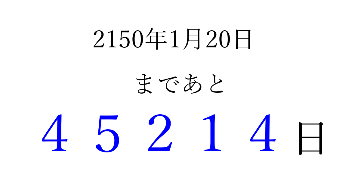 2150年1月20日(火)まで あと 99999 日です 追加すると、トップページからすぐ選べるようになります ※2026/04/06現在の結果です。 最新の状態に更新する ↓シェアして、タイムライン上にカウントダウンを表示しよう!↓ 📤 この結果を共有する Tweet シェア Threads Bluesky 別の日付でカウントダウン 2150年1月のカレンダー このページをブックマークに追加すると、いつでもカウントダウンを確認できます。 (PC: Ctrl+D / Mac: ⌘+D) hitome-notes.comでは以下のページも運営しています。 指定日と期間から日付を計算 | ガチャ確率計算・シミュレーション | プライバシー・ポリシー 運営者:Avocado