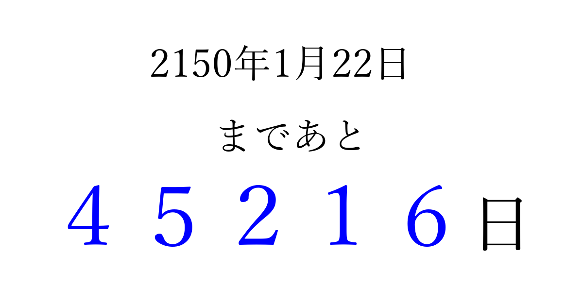 2150年1月22日(木)まで あと 99999 日です 追加すると、トップページからすぐ選べるようになります ※2026/04/06現在の結果です。 最新の状態に更新する ↓シェアして、タイムライン上にカウントダウンを表示しよう!↓ 📤 この結果を共有する Tweet シェア Threads Bluesky 別の日付でカウントダウン 2150年1月のカレンダー このページをブックマークに追加すると、いつでもカウントダウンを確認できます。 (PC: Ctrl+D / Mac: ⌘+D) hitome-notes.comでは以下のページも運営しています。 指定日と期間から日付を計算 | ガチャ確率計算・シミュレーション | プライバシー・ポリシー 運営者:Avocado
