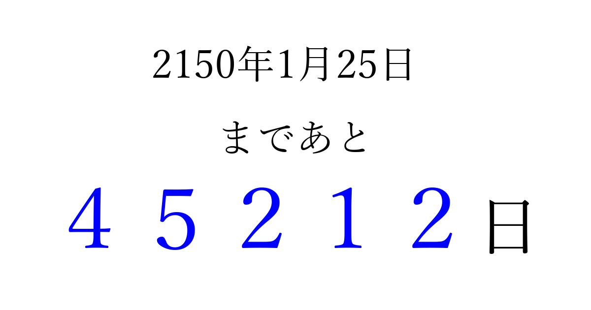 2150年1月25日(日)まで あと 99999 日です 追加すると、トップページからすぐ選べるようになります ※2026/04/13現在の結果です。 最新の状態に更新する ↓シェアして、タイムライン上にカウントダウンを表示しよう!↓ 📤 この結果を共有する Tweet シェア Threads Bluesky 別の日付でカウントダウン 2150年1月のカレンダー このページをブックマークに追加すると、いつでもカウントダウンを確認できます。 (PC: Ctrl+D / Mac: ⌘+D) hitome-notes.comでは以下のページも運営しています。 指定日と期間から日付を計算 | ガチャ確率計算・シミュレーション | プライバシー・ポリシー 運営者:Avocado