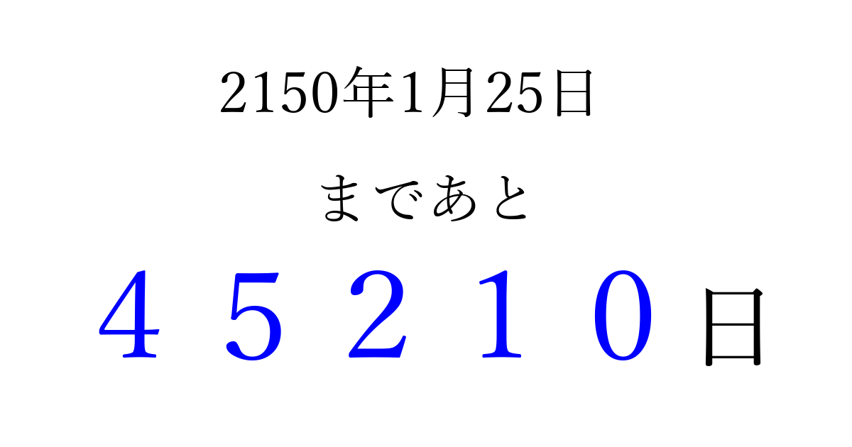 2150年1月25日(日)まで あと 99999 日です 追加すると、トップページからすぐ選べるようになります ※2026/04/15現在の結果です。 最新の状態に更新する ↓シェアして、タイムライン上にカウントダウンを表示しよう!↓ 📤 この結果を共有する Tweet シェア Threads Bluesky 別の日付でカウントダウン 2150年1月のカレンダー このページをブックマークに追加すると、いつでもカウントダウンを確認できます。 (PC: Ctrl+D / Mac: ⌘+D) hitome-notes.comでは以下のページも運営しています。 指定日と期間から日付を計算 | ガチャ確率計算・シミュレーション | プライバシー・ポリシー 運営者:Avocado