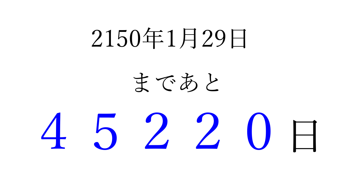 2150年1月29日(木)まで あと 99999 日です 追加すると、トップページからすぐ選べるようになります ※2026/04/09現在の結果です。 最新の状態に更新する ↓シェアして、タイムライン上にカウントダウンを表示しよう!↓ 📤 この結果を共有する Tweet シェア Threads Bluesky 別の日付でカウントダウン 2150年1月のカレンダー このページをブックマークに追加すると、いつでもカウントダウンを確認できます。 (PC: Ctrl+D / Mac: ⌘+D) hitome-notes.comでは以下のページも運営しています。 指定日と期間から日付を計算 | ガチャ確率計算・シミュレーション | プライバシー・ポリシー 運営者:Avocado