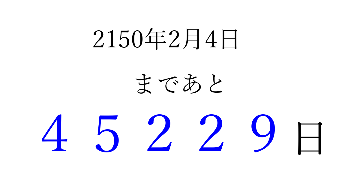 2150年2月4日(水)まで あと 99999 日です 追加すると、トップページからすぐ選べるようになります ※2026/04/06現在の結果です。 最新の状態に更新する ↓シェアして、タイムライン上にカウントダウンを表示しよう!↓ 📤 この結果を共有する Tweet シェア Threads Bluesky 別の日付でカウントダウン 2150年2月のカレンダー このページをブックマークに追加すると、いつでもカウントダウンを確認できます。 (PC: Ctrl+D / Mac: ⌘+D) hitome-notes.comでは以下のページも運営しています。 指定日と期間から日付を計算 | ガチャ確率計算・シミュレーション | プライバシー・ポリシー 運営者:Avocado