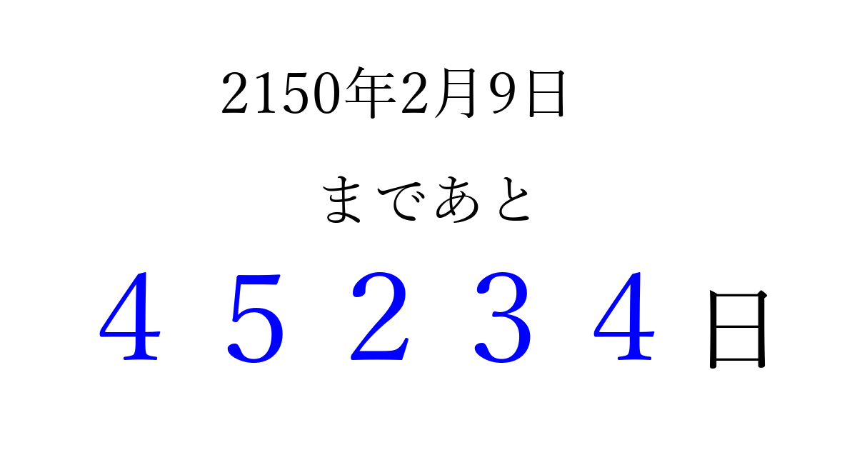 2150年2月9日(月)まで あと 99999 日です 追加すると、トップページからすぐ選べるようになります ※2026/04/06現在の結果です。 最新の状態に更新する ↓シェアして、タイムライン上にカウントダウンを表示しよう!↓ 📤 この結果を共有する Tweet シェア Threads Bluesky 別の日付でカウントダウン 2150年2月のカレンダー このページをブックマークに追加すると、いつでもカウントダウンを確認できます。 (PC: Ctrl+D / Mac: ⌘+D) hitome-notes.comでは以下のページも運営しています。 指定日と期間から日付を計算 | ガチャ確率計算・シミュレーション | プライバシー・ポリシー 運営者:Avocado