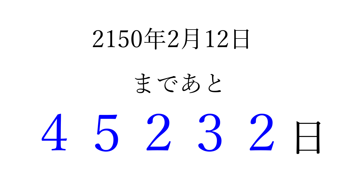 2150年2月12日(木)まで あと 99999 日です 追加すると、トップページからすぐ選べるようになります ※2026/04/11現在の結果です。 最新の状態に更新する ↓シェアして、タイムライン上にカウントダウンを表示しよう!↓ 📤 この結果を共有する Tweet シェア Threads Bluesky 別の日付でカウントダウン 2150年2月のカレンダー このページをブックマークに追加すると、いつでもカウントダウンを確認できます。 (PC: Ctrl+D / Mac: ⌘+D) hitome-notes.comでは以下のページも運営しています。 指定日と期間から日付を計算 | ガチャ確率計算・シミュレーション | プライバシー・ポリシー 運営者:Avocado
