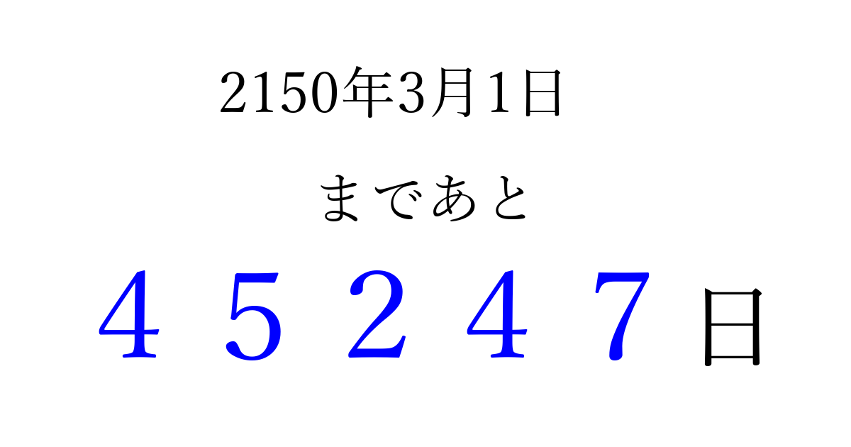 2150年3月1日(日)まで あと 99999 日です 追加すると、トップページからすぐ選べるようになります ※2026/04/13現在の結果です。 最新の状態に更新する ↓シェアして、タイムライン上にカウントダウンを表示しよう!↓ 📤 この結果を共有する Tweet シェア Threads Bluesky 別の日付でカウントダウン 2150年3月のカレンダー このページをブックマークに追加すると、いつでもカウントダウンを確認できます。 (PC: Ctrl+D / Mac: ⌘+D) hitome-notes.comでは以下のページも運営しています。 指定日と期間から日付を計算 | ガチャ確率計算・シミュレーション | プライバシー・ポリシー 運営者:Avocado