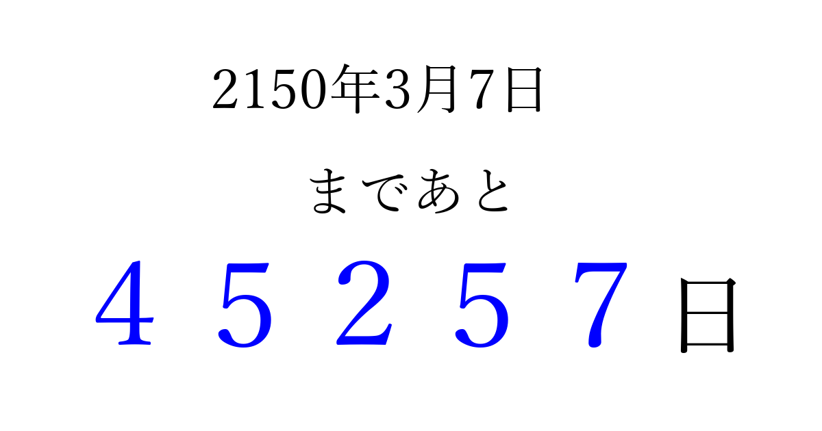 2150年3月7日(土)まで あと 99999 日です 追加すると、トップページからすぐ選べるようになります ※2026/04/09現在の結果です。 最新の状態に更新する ↓シェアして、タイムライン上にカウントダウンを表示しよう!↓ 📤 この結果を共有する Tweet シェア Threads Bluesky 別の日付でカウントダウン 2150年3月のカレンダー このページをブックマークに追加すると、いつでもカウントダウンを確認できます。 (PC: Ctrl+D / Mac: ⌘+D) hitome-notes.comでは以下のページも運営しています。 指定日と期間から日付を計算 | ガチャ確率計算・シミュレーション | プライバシー・ポリシー 運営者:Avocado