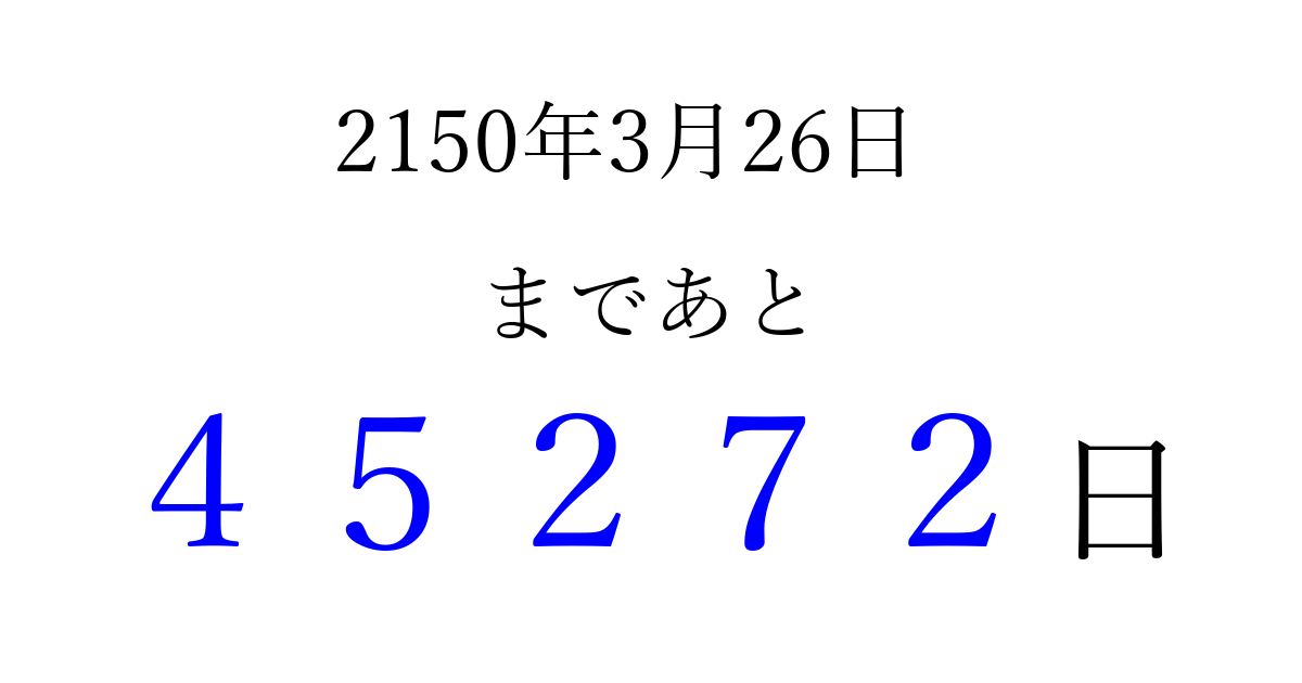 2150年3月26日(木)まで あと 99999 日です 追加すると、トップページからすぐ選べるようになります ※2026/04/13現在の結果です。 最新の状態に更新する ↓シェアして、タイムライン上にカウントダウンを表示しよう!↓ 📤 この結果を共有する Tweet シェア Threads Bluesky 別の日付でカウントダウン 2150年3月のカレンダー このページをブックマークに追加すると、いつでもカウントダウンを確認できます。 (PC: Ctrl+D / Mac: ⌘+D) hitome-notes.comでは以下のページも運営しています。 指定日と期間から日付を計算 | ガチャ確率計算・シミュレーション | プライバシー・ポリシー 運営者:Avocado