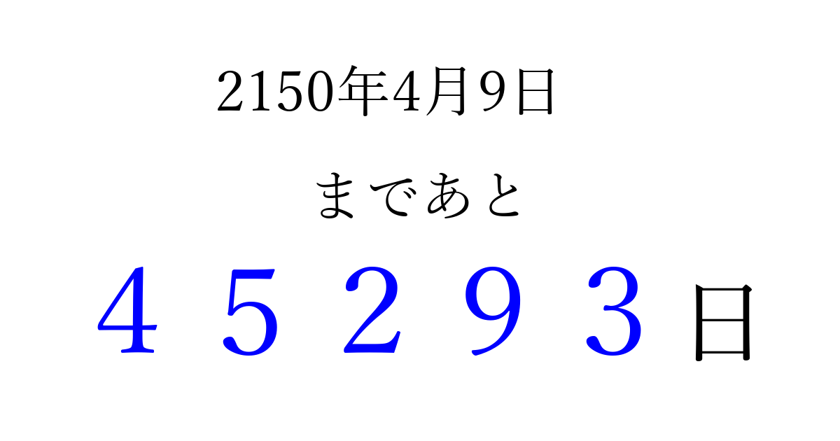 2150年4月9日(木)まで あと 99999 日です 追加すると、トップページからすぐ選べるようになります ※2026/04/06現在の結果です。 最新の状態に更新する ↓シェアして、タイムライン上にカウントダウンを表示しよう!↓ 📤 この結果を共有する Tweet シェア Threads Bluesky 別の日付でカウントダウン 2150年4月のカレンダー このページをブックマークに追加すると、いつでもカウントダウンを確認できます。 (PC: Ctrl+D / Mac: ⌘+D) hitome-notes.comでは以下のページも運営しています。 指定日と期間から日付を計算 | ガチャ確率計算・シミュレーション | プライバシー・ポリシー 運営者:Avocado