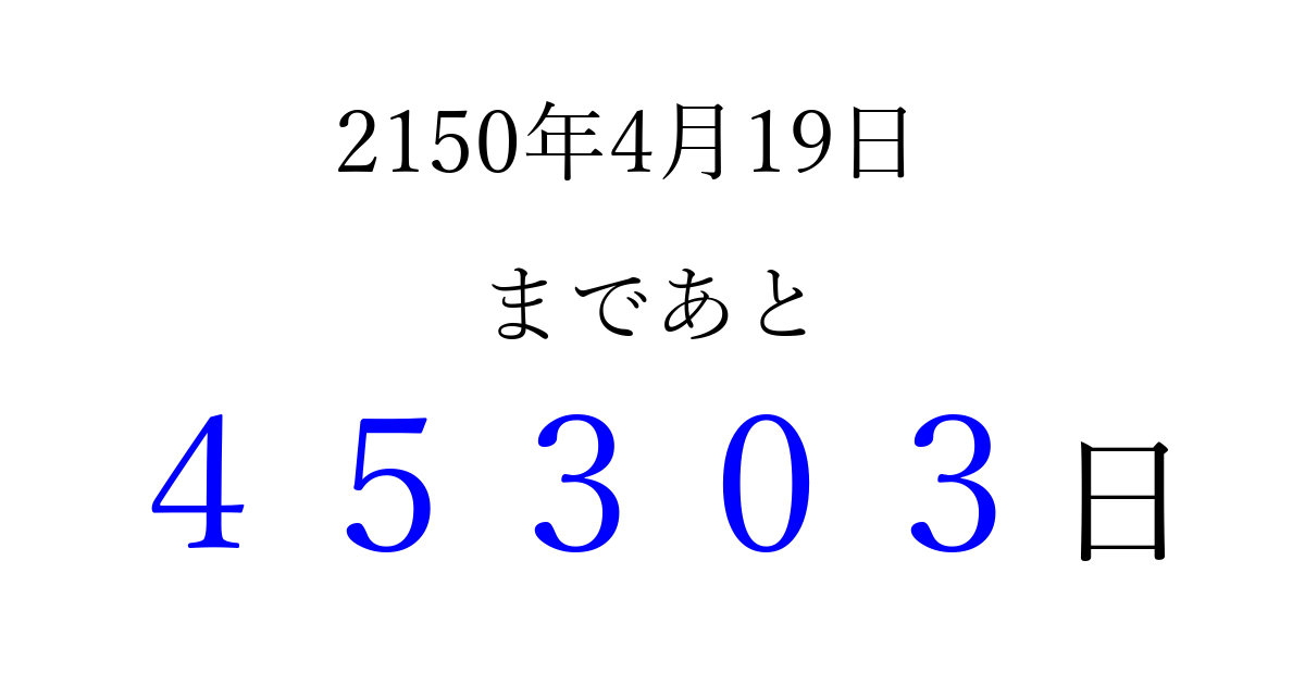 2150年4月19日(日)まで あと 99999 日です 追加すると、トップページからすぐ選べるようになります ※2026/04/06現在の結果です。 最新の状態に更新する ↓シェアして、タイムライン上にカウントダウンを表示しよう!↓ 📤 この結果を共有する Tweet シェア Threads Bluesky 別の日付でカウントダウン 2150年4月のカレンダー このページをブックマークに追加すると、いつでもカウントダウンを確認できます。 (PC: Ctrl+D / Mac: ⌘+D) hitome-notes.comでは以下のページも運営しています。 指定日と期間から日付を計算 | ガチャ確率計算・シミュレーション | プライバシー・ポリシー 運営者:Avocado