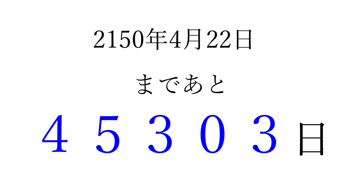 2150年4月22日(水)まで あと 99999 日です 追加すると、トップページからすぐ選べるようになります ※2026/04/09現在の結果です。 最新の状態に更新する ↓シェアして、タイムライン上にカウントダウンを表示しよう!↓ 📤 この結果を共有する Tweet シェア Threads Bluesky 別の日付でカウントダウン 2150年4月のカレンダー このページをブックマークに追加すると、いつでもカウントダウンを確認できます。 (PC: Ctrl+D / Mac: ⌘+D) hitome-notes.comでは以下のページも運営しています。 指定日と期間から日付を計算 | ガチャ確率計算・シミュレーション | プライバシー・ポリシー 運営者:Avocado