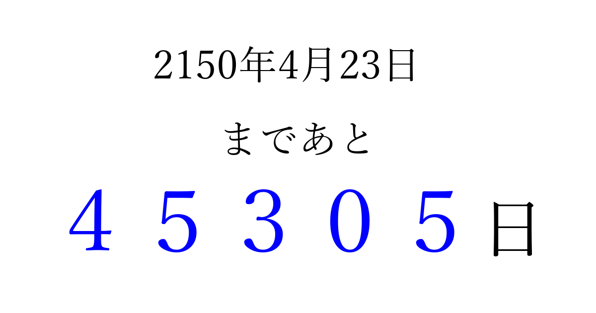 2150年4月23日(木)まで あと 99999 日です 追加すると、トップページからすぐ選べるようになります ※2026/04/08現在の結果です。 最新の状態に更新する ↓シェアして、タイムライン上にカウントダウンを表示しよう!↓ 📤 この結果を共有する Tweet シェア Threads Bluesky 別の日付でカウントダウン 2150年4月のカレンダー このページをブックマークに追加すると、いつでもカウントダウンを確認できます。 (PC: Ctrl+D / Mac: ⌘+D) hitome-notes.comでは以下のページも運営しています。 指定日と期間から日付を計算 | ガチャ確率計算・シミュレーション | プライバシー・ポリシー 運営者:Avocado