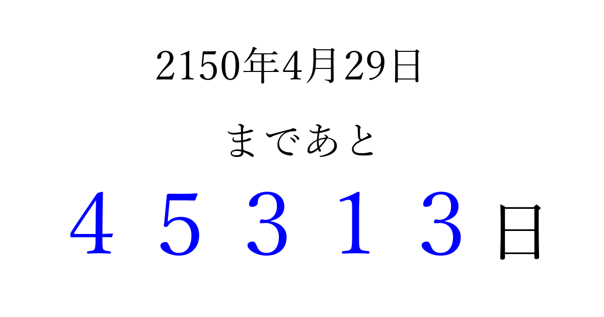 2150年4月29日(水)まで あと 99999 日です 追加すると、トップページからすぐ選べるようになります ※2026/04/06現在の結果です。 最新の状態に更新する ↓シェアして、タイムライン上にカウントダウンを表示しよう!↓ 📤 この結果を共有する Tweet シェア Threads Bluesky 別の日付でカウントダウン 2150年4月のカレンダー このページをブックマークに追加すると、いつでもカウントダウンを確認できます。 (PC: Ctrl+D / Mac: ⌘+D) hitome-notes.comでは以下のページも運営しています。 指定日と期間から日付を計算 | ガチャ確率計算・シミュレーション | プライバシー・ポリシー 運営者:Avocado