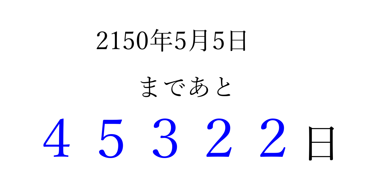 2150年5月5日(火)まで あと 99999 日です 追加すると、トップページからすぐ選べるようになります ※2026/04/03現在の結果です。 最新の状態に更新する ↓シェアして、タイムライン上にカウントダウンを表示しよう!↓ 📤 この結果を共有する Tweet シェア Threads Bluesky 別の日付でカウントダウン 2150年5月のカレンダー このページをブックマークに追加すると、いつでもカウントダウンを確認できます。 (PC: Ctrl+D / Mac: ⌘+D) hitome-notes.comでは以下のページも運営しています。 指定日と期間から日付を計算 | ガチャ確率計算・シミュレーション | プライバシー・ポリシー 運営者:Avocado