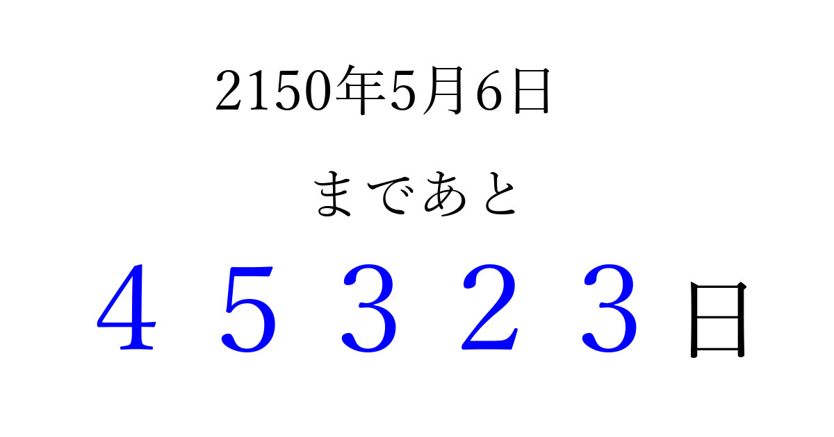 2150年5月6日(水)まで あと 99999 日です 追加すると、トップページからすぐ選べるようになります ※2026/04/03現在の結果です。 最新の状態に更新する ↓シェアして、タイムライン上にカウントダウンを表示しよう!↓ 📤 この結果を共有する Tweet シェア Threads Bluesky 別の日付でカウントダウン 2150年5月のカレンダー このページをブックマークに追加すると、いつでもカウントダウンを確認できます。 (PC: Ctrl+D / Mac: ⌘+D) hitome-notes.comでは以下のページも運営しています。 指定日と期間から日付を計算 | ガチャ確率計算・シミュレーション | プライバシー・ポリシー 運営者:Avocado