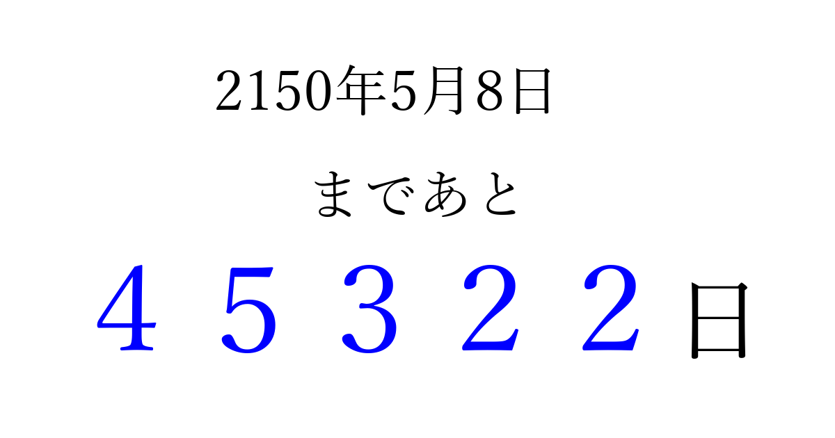 2150年5月8日(金)まで あと 99999 日です 追加すると、トップページからすぐ選べるようになります ※2026/04/06現在の結果です。 最新の状態に更新する ↓シェアして、タイムライン上にカウントダウンを表示しよう!↓ 📤 この結果を共有する Tweet シェア Threads Bluesky 別の日付でカウントダウン 2150年5月のカレンダー このページをブックマークに追加すると、いつでもカウントダウンを確認できます。 (PC: Ctrl+D / Mac: ⌘+D) hitome-notes.comでは以下のページも運営しています。 指定日と期間から日付を計算 | ガチャ確率計算・シミュレーション | プライバシー・ポリシー 運営者:Avocado