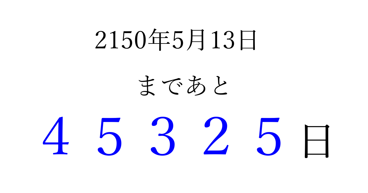 2150年5月13日(水)まで あと 99999 日です 追加すると、トップページからすぐ選べるようになります ※2026/04/08現在の結果です。 最新の状態に更新する ↓シェアして、タイムライン上にカウントダウンを表示しよう!↓ 📤 この結果を共有する Tweet シェア Threads Bluesky 別の日付でカウントダウン 2150年5月のカレンダー このページをブックマークに追加すると、いつでもカウントダウンを確認できます。 (PC: Ctrl+D / Mac: ⌘+D) hitome-notes.comでは以下のページも運営しています。 指定日と期間から日付を計算 | ガチャ確率計算・シミュレーション | プライバシー・ポリシー 運営者:Avocado