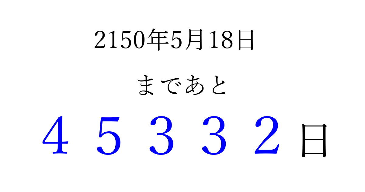 2150年5月18日(月)まで あと 99999 日です 追加すると、トップページからすぐ選べるようになります ※2026/04/06現在の結果です。 最新の状態に更新する ↓シェアして、タイムライン上にカウントダウンを表示しよう!↓ 📤 この結果を共有する Tweet シェア Threads Bluesky 別の日付でカウントダウン 2150年5月のカレンダー このページをブックマークに追加すると、いつでもカウントダウンを確認できます。 (PC: Ctrl+D / Mac: ⌘+D) hitome-notes.comでは以下のページも運営しています。 指定日と期間から日付を計算 | ガチャ確率計算・シミュレーション | プライバシー・ポリシー 運営者:Avocado